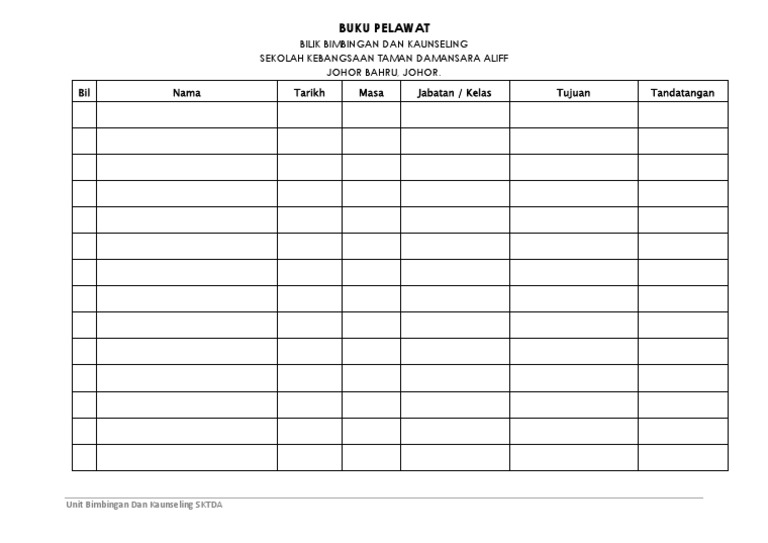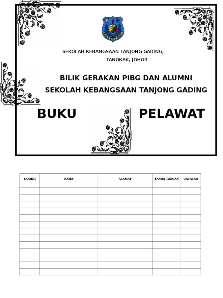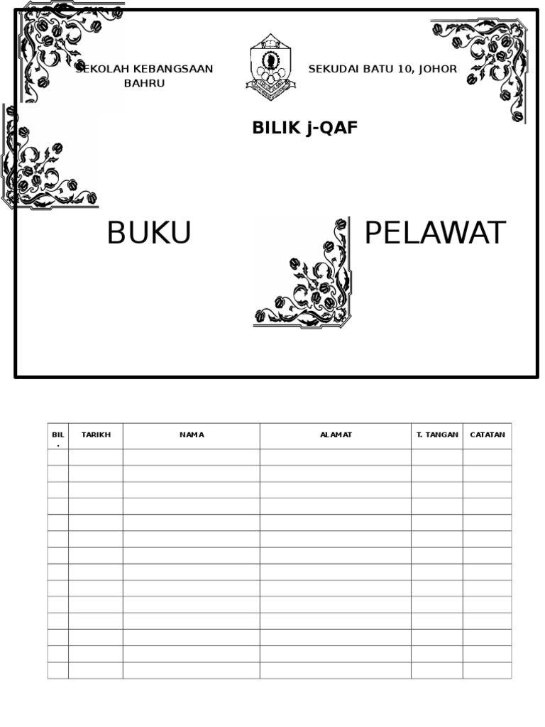 Definisi Buku Pelawat Buku pelawat ialah kertas untuk pengunjung mengakui lawatan ke tapak kejadian dan meninggalkan butir butir seperti nama pelawat tarikh dilawati jam lawatan catatan dan tanda tangan pelawat. Buku Pengurusan Sekolah 2022 SMK Tengku Bariah DOA AWAL SESI PERSEKOLAHAN YA ALLAH YA TUHAN KAMI BERKATILAH DAN RAHMATILAH KAMI DENGAN INAYAH DAN KASIH SAYANGMU KURNIAKANLAH TAUFIQ DAN HIDAYAHMU KEPADA KAMI DALAM USAHA KAMI MENDAPATKAN KEREDHAANMU YA ALLAH YA TUHAN KAMI. Setiap pelawat ke sekolah mesti melaporkan diri di pondok pengawal dan meninggalkan kad pengenalan sebelum masuk ke kawasan sekolah.